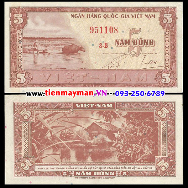 Tiền VNCH 5 Đồng 1955 P-13 | 5 đồng trâu cày ruộng nhà nông thôn