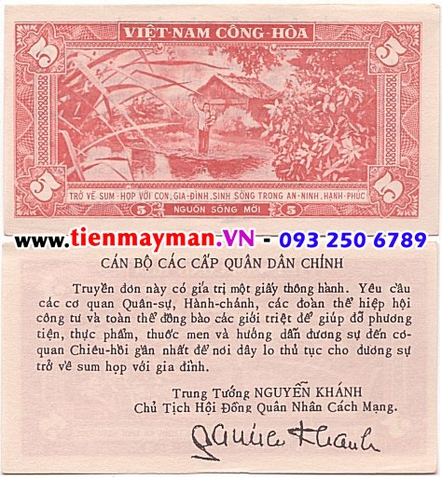 Tiền VNCH 5 Đồng chiêu hồi 1955 (tuyên truyền chống Cách Mạng) P-13x