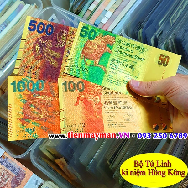 Bộ tiền tứ linh mạ vàng kỷ niệm Hồng Kông gồm 4 tờ: Long, Lân, Quy, Phụng