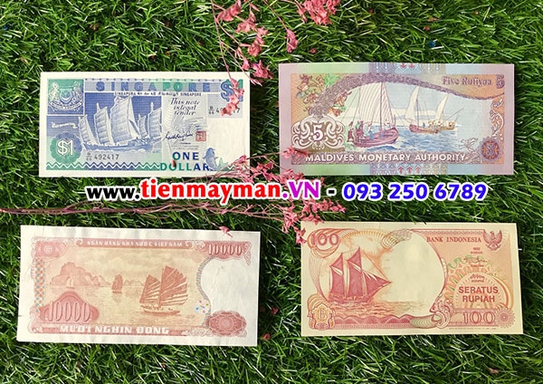 Bộ tiền lì xì may mắn 4 tờ tiền thuận buồm xuôi gió gồm: Việt Nam (10.000 đồng) , Singapore ( 1 dollar) , Indonesia ( 100 rupiah) , Maldives ( 5 ruffia) là những tờ tiền có hình ảnh những cánh buồm căng gió mang lời chúc của người tặng gửi đến người nhận sự thuận lợi , hanh thông trong mọi việc ,xuôi chèo mát mái , gặp nhiều may mắn để tiến tới được mong muốn, ước nguyện hay mục tiêu mình đặt ra trong công việc và cuộc sống.