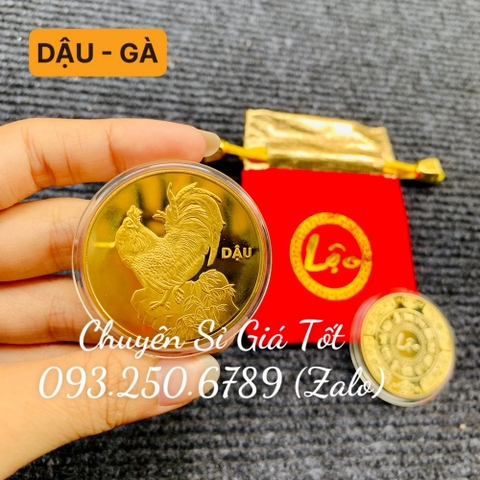 Đồng Tiền Xu Con GÀ (DẬU) Mạ Vàng Kèm Túi gấm đỏ LỘC
