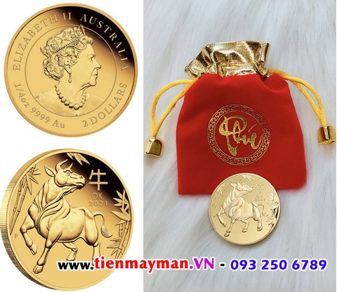 Tặng kèm túi gấm nhung đỏ chữ PHÚC kèm mỗi cặp xu Úc hình con trâu vàng 2021
