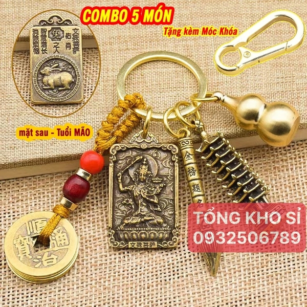 Móc Khóa Phật Bản Mệnh 5 Món TUỔI MÃO: Dây 5 Xu + Quả Bầu Rỗng + Thẻ 2 Mặt Phật Bản Mệnh, tặng móc bấm