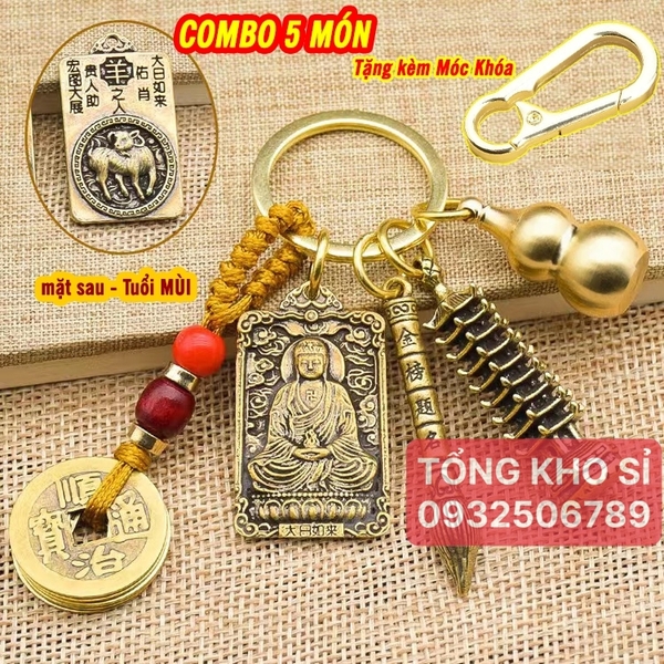 Móc Khóa Phật Bản Mệnh 5 Món TUỔI MÙI: Dây 5 Xu + Quả Bầu Rỗng + Thẻ 2 Mặt Phật Bản Mệnh, tặng móc bấm