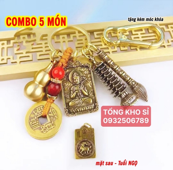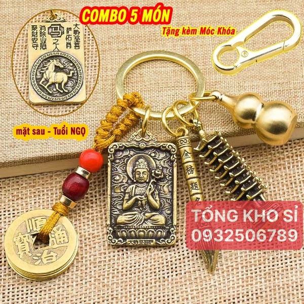 Móc Khóa Phật Bản Mệnh 5 Món TUỔI NGỌ: Dây 5 Xu + Quả Bầu Rỗng + Thẻ 2 Mặt Phật Bản Mệnh, tặng móc bấm