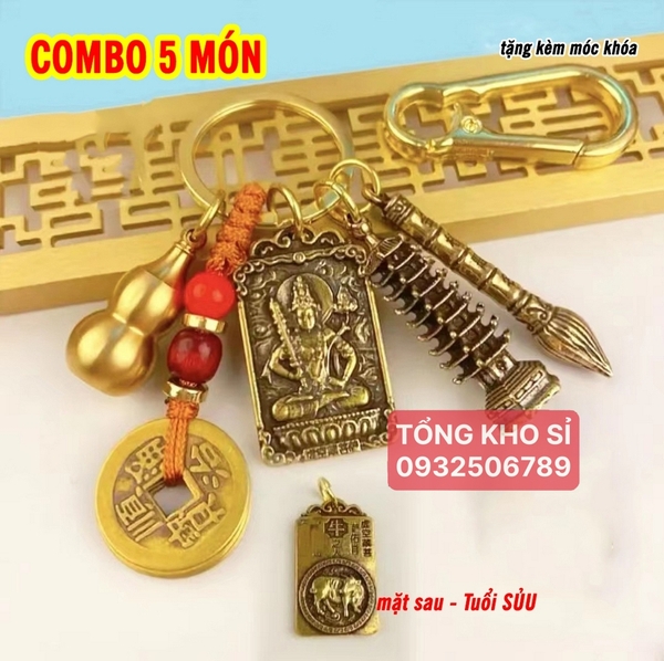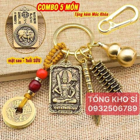 Móc Khóa Phật Bản Mệnh 5 Món TUỔI SỬU: Dây 5 Xu + Quả Bầu Rỗng + Thẻ 2 Mặt Phật Bản Mệnh, tặng móc bấm