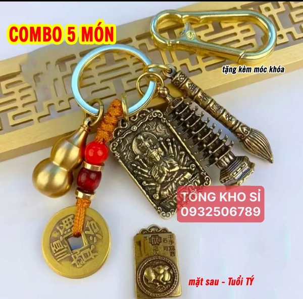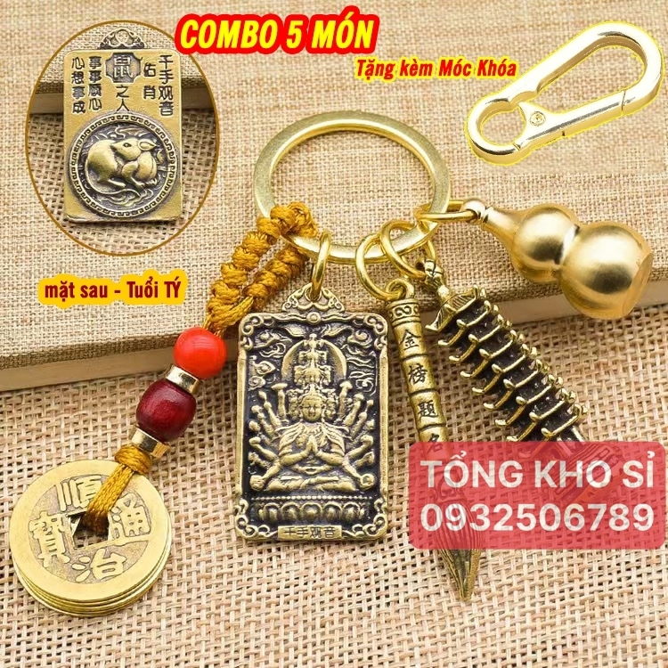 Móc Khóa Phật Bản Mệnh 5 Món TUỔI TÝ : Dây 5 Xu + Quả Bầu Rỗng + Thẻ 2 Mặt Phật Bản Mệnh, tặng móc bấm