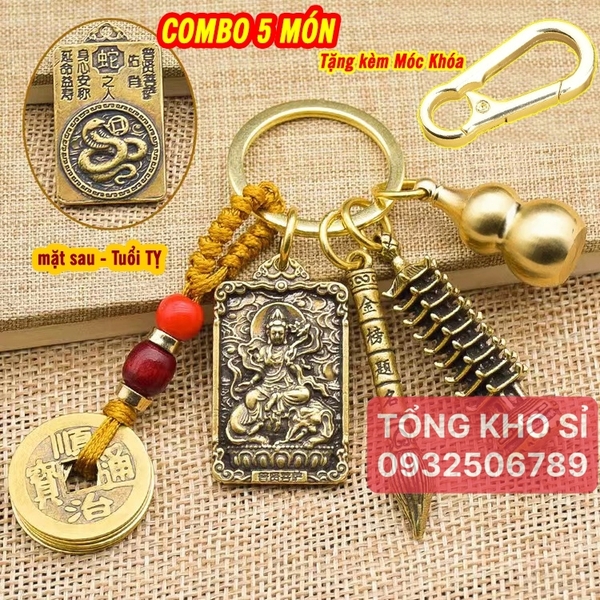 Móc Khóa Phật Bản Mệnh 5 Món TUỔI TỴ: Dây 5 Xu + Quả Bầu Rỗng + Thẻ 2 Mặt Phật Bản Mệnh, tặng móc bấm