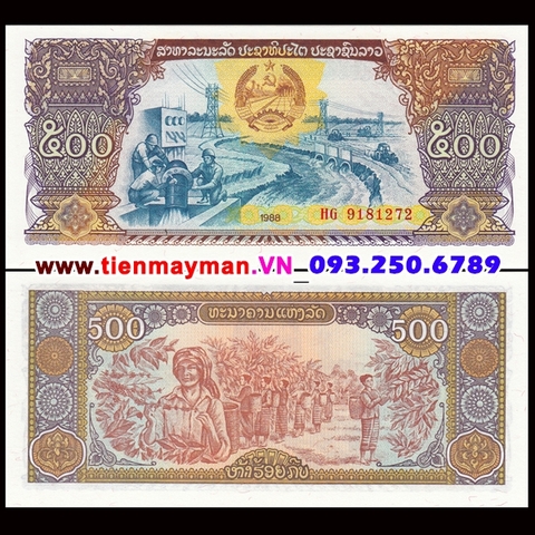 Mặt trước: Văn bản Lào; Công nhân điều chỉnh đường ống tưới; tháp điện; huy hiệu; máy kéo.