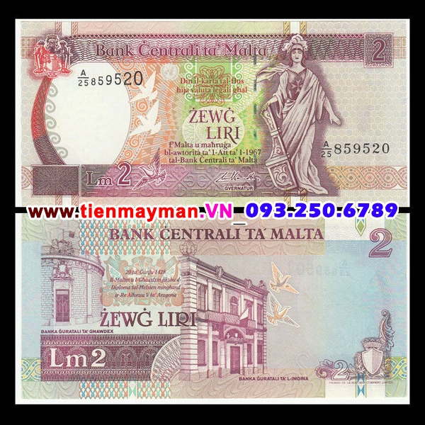 Mặt trước : Biểu tượng của Ngân hàng Trung ương Malta. Hình của một người phụ nữ ngụ ngôn cầm một bánh lái, tượng trưng cho Malta kiểm soát vận mệnh của chính mình. Chim bồ câu (tượng trưng cho hòa bình). Biểu tượng Liên Hợp Quốc.