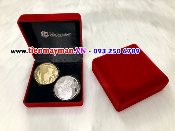 Sản phầm gồm 2 đồng xu vàng + bạc đặt trong hộp nhung đỏ