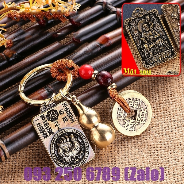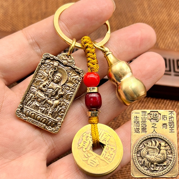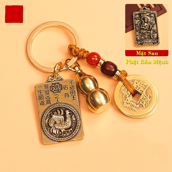 [TUỔI DẬU] Móc Khóa Đồng Thau 12 Con Giáp 3 Món, Dây 5 Xu + Quả Bầu Rỗng + Thẻ 2 Mặt Phật Bản Mệnh mỗi con giáp