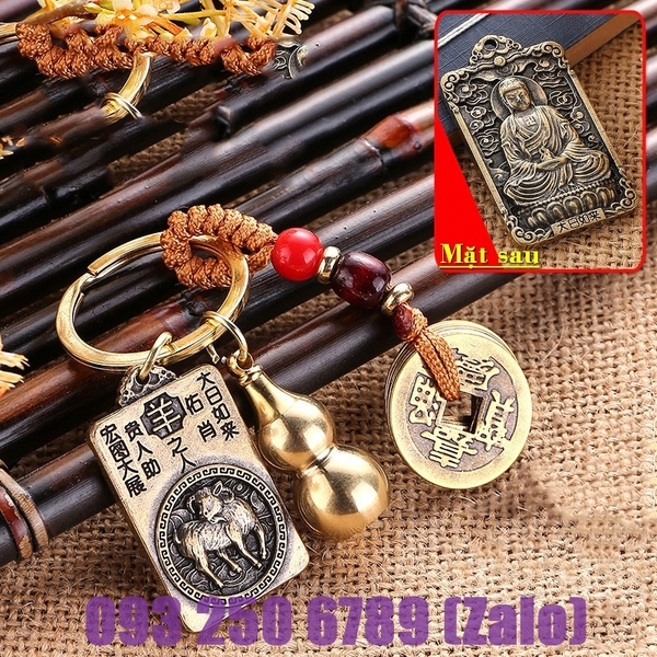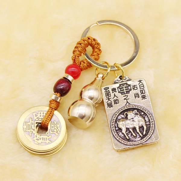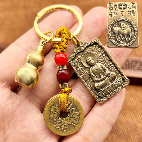 [TUỔI MÙI] Móc Khóa Đồng Thau 12 Con Giáp 3 Món, Dây 5 Xu + Quả Bầu Rỗng + Thẻ 2 Mặt Phật Bản Mệnh mỗi con giáp