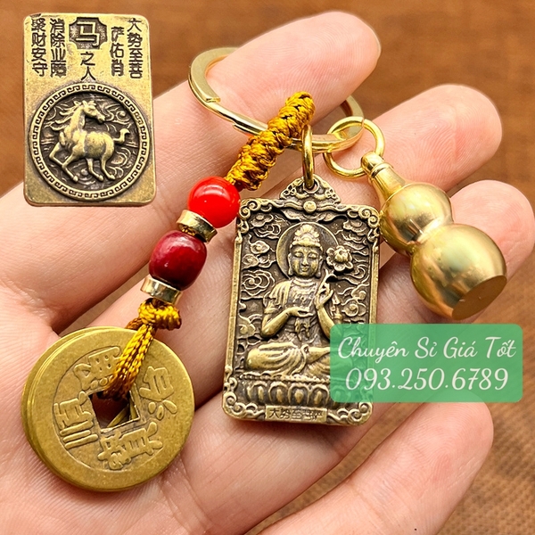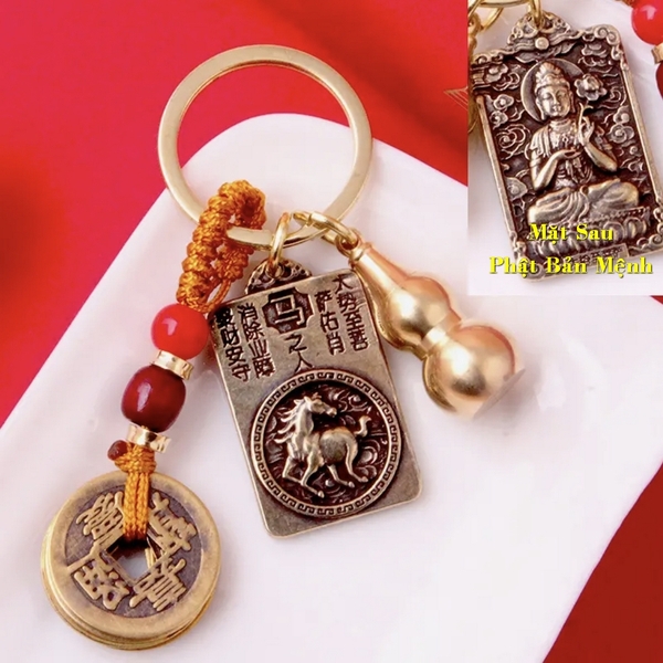 [TUỔI NGỌ] Móc Khóa Đồng Thau 12 Con Giáp 3 Món, Dây 5 Xu + Quả Bầu Rỗng + Thẻ 2 Mặt Phật Bản Mệnh mỗi con giáp