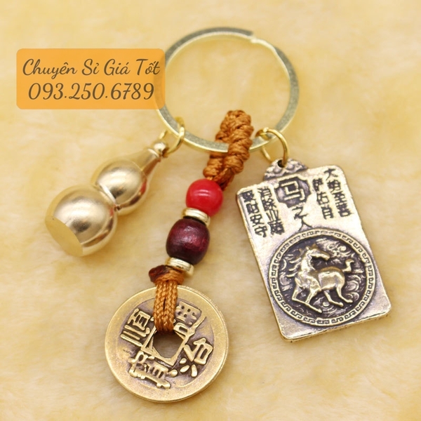 [TUỔI NGỌ] Móc Khóa Đồng Thau 12 Con Giáp, Gồm 3 Món Dây 5 Xu, Bầu Rỗng,Thẻ Phật Bản Mệnh 12 Con Giáp Kèm Cát Đỏ