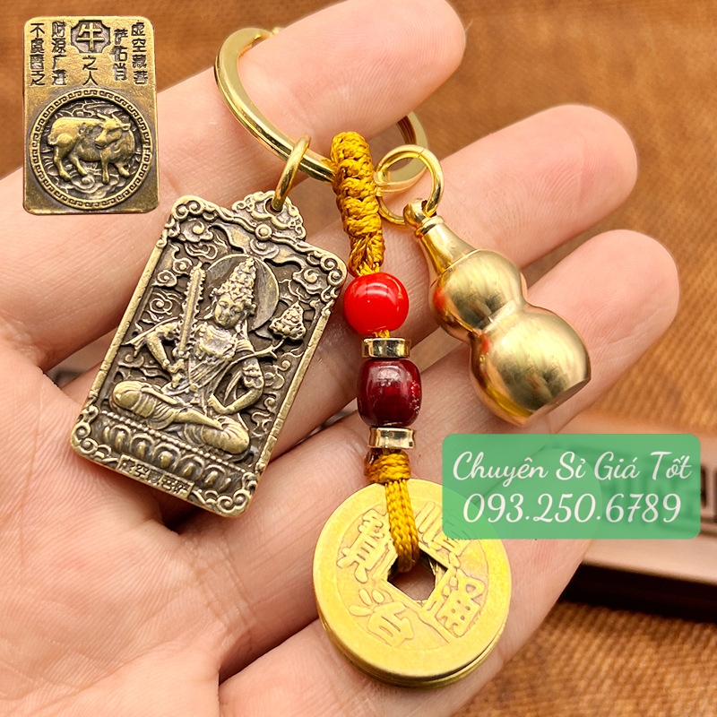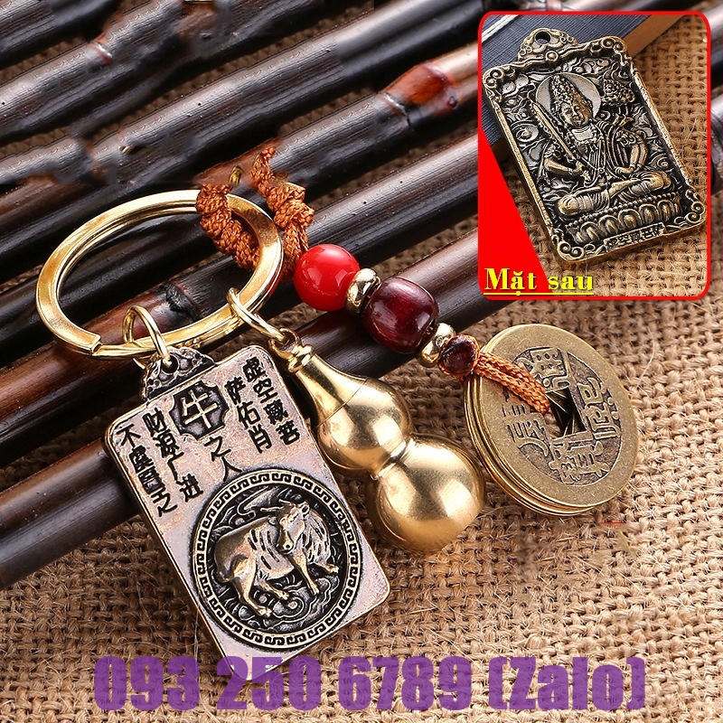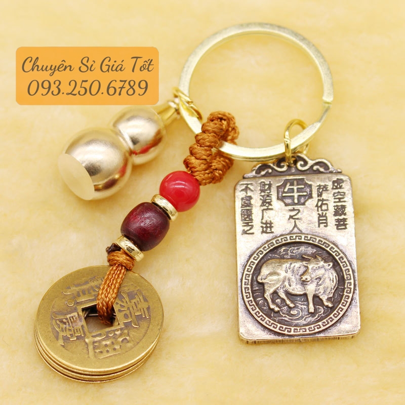 [TUỔI SỬU] Móc Khóa Đồng Thau 12 Con Giáp, Gồm 3 Món Dây 5 Xu, Bầu Rỗng,Thẻ Phật Bản Mệnh 12 Con Giáp Kèm Cát Đỏ