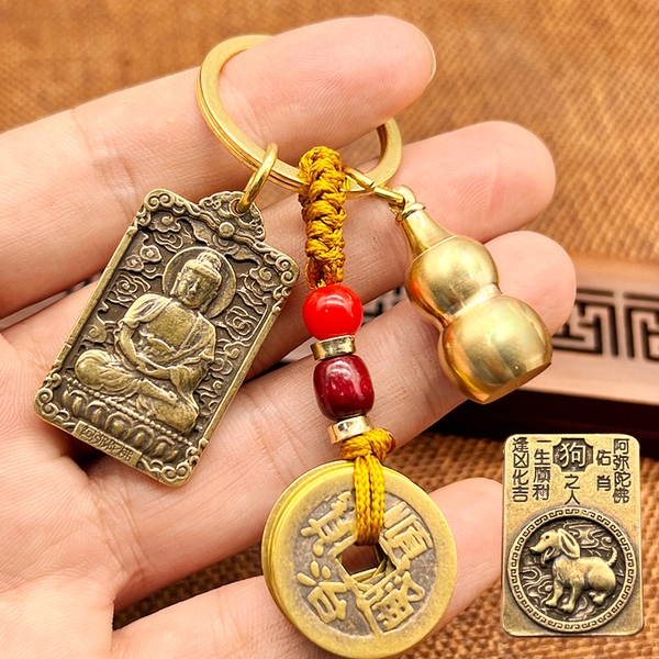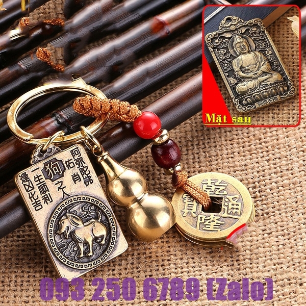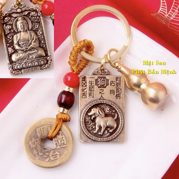 [TUỔI TUẤT] Móc Khóa Đồng Thau 12 Con Giáp 3 Món, Dây 5 Xu + Quả Bầu Rỗng + Thẻ 2 Mặt Phật Bản Mệnh mỗi con giáp