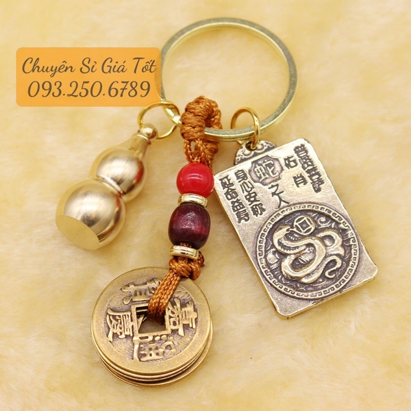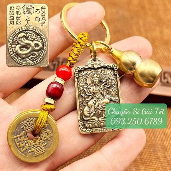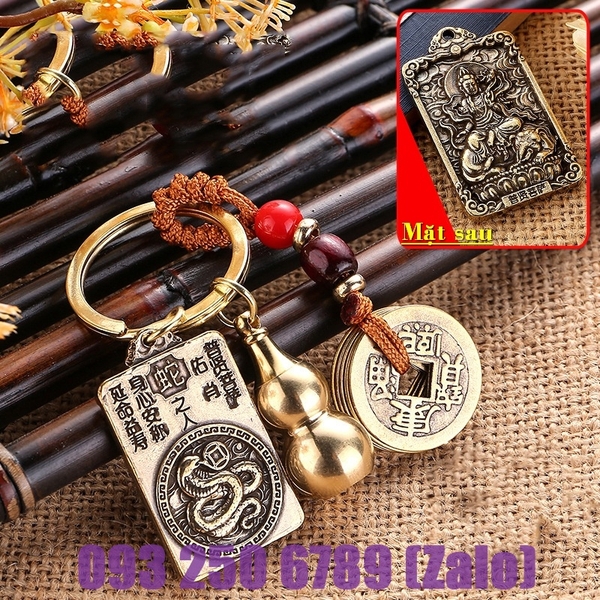 [TUỔI TỴ] Móc Khóa Đồng Thau 12 Con Giáp 3 Món, Dây 5 Xu + Quả Bầu Rỗng + Thẻ 2 Mặt Phật Bản Mệnh mỗi con giáp